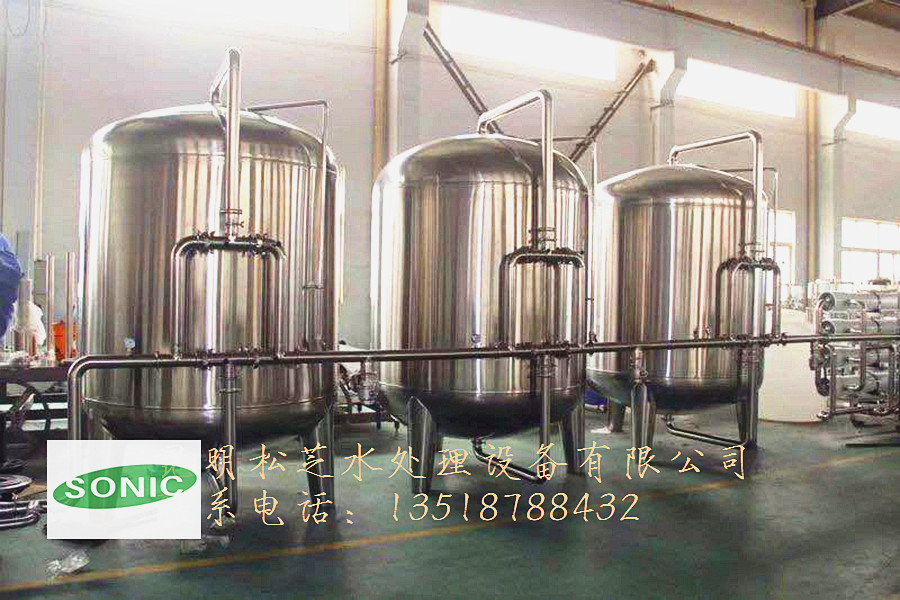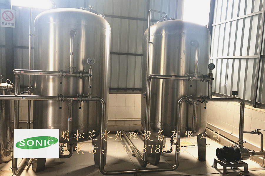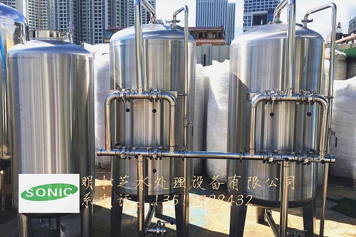地下水、水庫水中含有多種雜質(zhì),如懸浮物、膠體、重金屬、有機(jī)物、鐵銹和無機(jī)鹽等,為保證水質(zhì)達(dá)標(biāo),則必須先去除水中的懸浮物、膠體、有機(jī)物等,使反滲透的進(jìn)水達(dá)到要求,故本系統(tǒng)設(shè)置多介質(zhì)過濾器+活性炭過濾器+軟化器+殺菌作為原水處理系統(tǒng)。本處理系統(tǒng)包括原水箱、原水增壓泵、多介質(zhì)過濾器、活性炭過濾器、離子交換軟水器、殺菌設(shè)備、凈化水水箱及反洗系統(tǒng)。