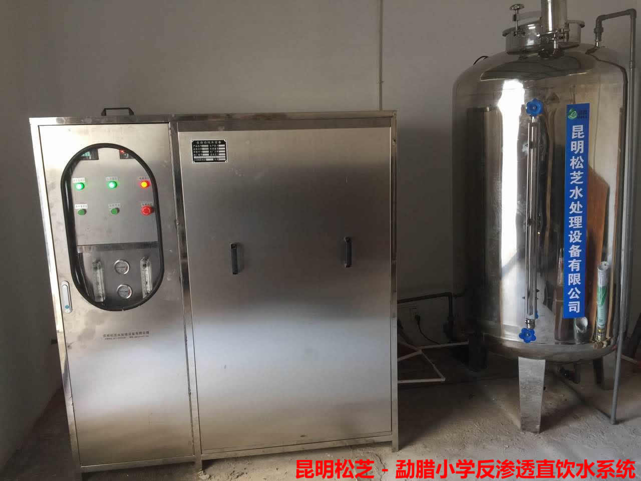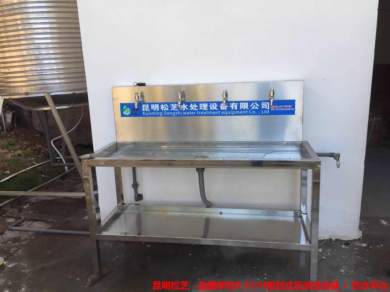 勐臘學(xué)校密封式0.5T/H反滲透設(shè)備 + 預(yù)處理系統(tǒng) + 飲水平臺(tái)