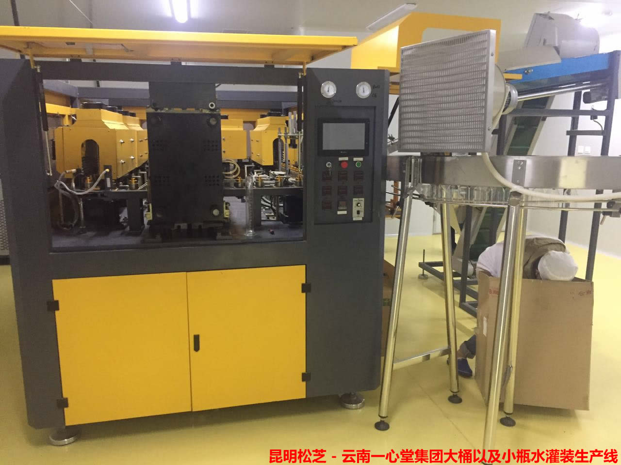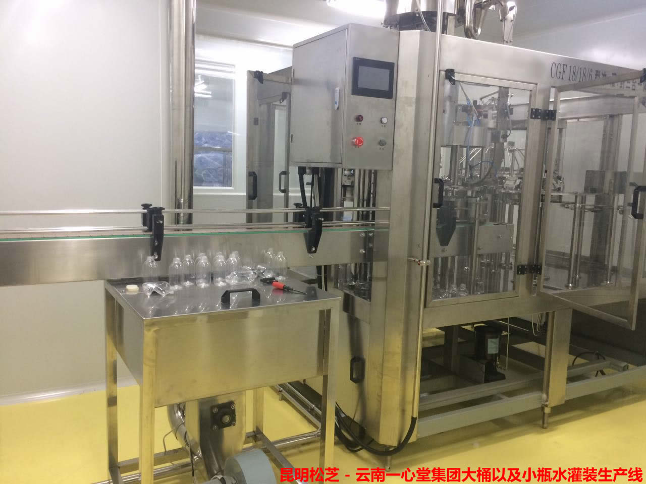 采用磁力扭矩式擰蓋頭,實現(xiàn)抓蓋、擰蓋功能。擰蓋力矩無級可調(diào),具有恒力矩旋封塑蓋功能。套標縮標一體機采用獨家設(shè)計往復式切刀,采機構(gòu)鋼體組合,動作平順,刀具壽命延長一倍。 簡易式中心導柱定位,規(guī)格更換更容易,操作者使用方便。機種首創(chuàng)同步帶瓶DC無刷馬達帶動。熱收縮包裝機選用德國、日本進口原件,包裝組合和瓶型改變時調(diào)整方便,性能穩(wěn)定,包裝效果極佳。整機采用人機界面觸摸屏控制、PLC電腦程序控制、變頻器控制等先進技術(shù)。具有供蓋系統(tǒng)自動控制、灌裝溫度自動檢測、物料高溫報警、低溫停機并自動回流、無瓶不加蓋、缺瓶等待、缺蓋停機等功能。產(chǎn)量3000-24000瓶/小時可供用戶選擇。